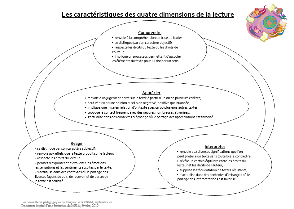 Les 4 dimensions correspondent aux 4 critères d’évaluation de la compétence à lire du Cadre d’évaluation du MELS. Ces quatre critères sont : comprendre, interpréter, réagir et apprécier.