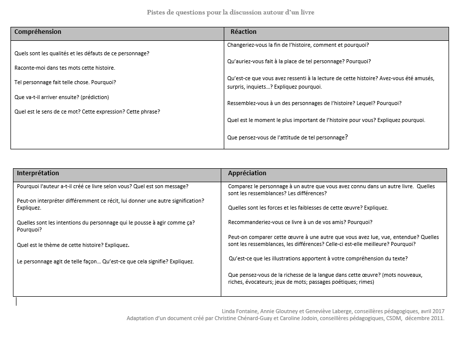 Afin de mener une discussion riche avec les élèves, il apparaît judicieux, entre autres, de bien s’approprier l’œuvre, de sélectionner les questions parmi celles proposées et de rester ouvert aux opportunités offertes par les commentaires des élèves. L’interaction peut se vivre pendant ou après la lecture.