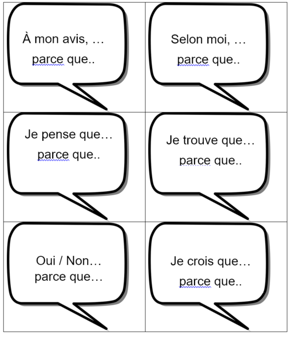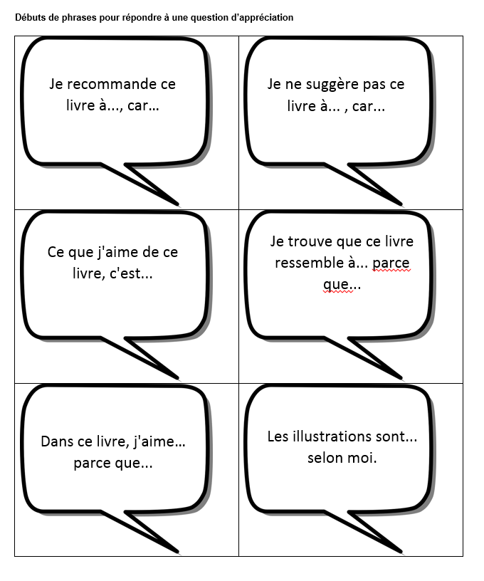 Début de phrases pour aider les élèves à formuler leurs réponses aux questions de réaction et d’appréciation.