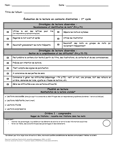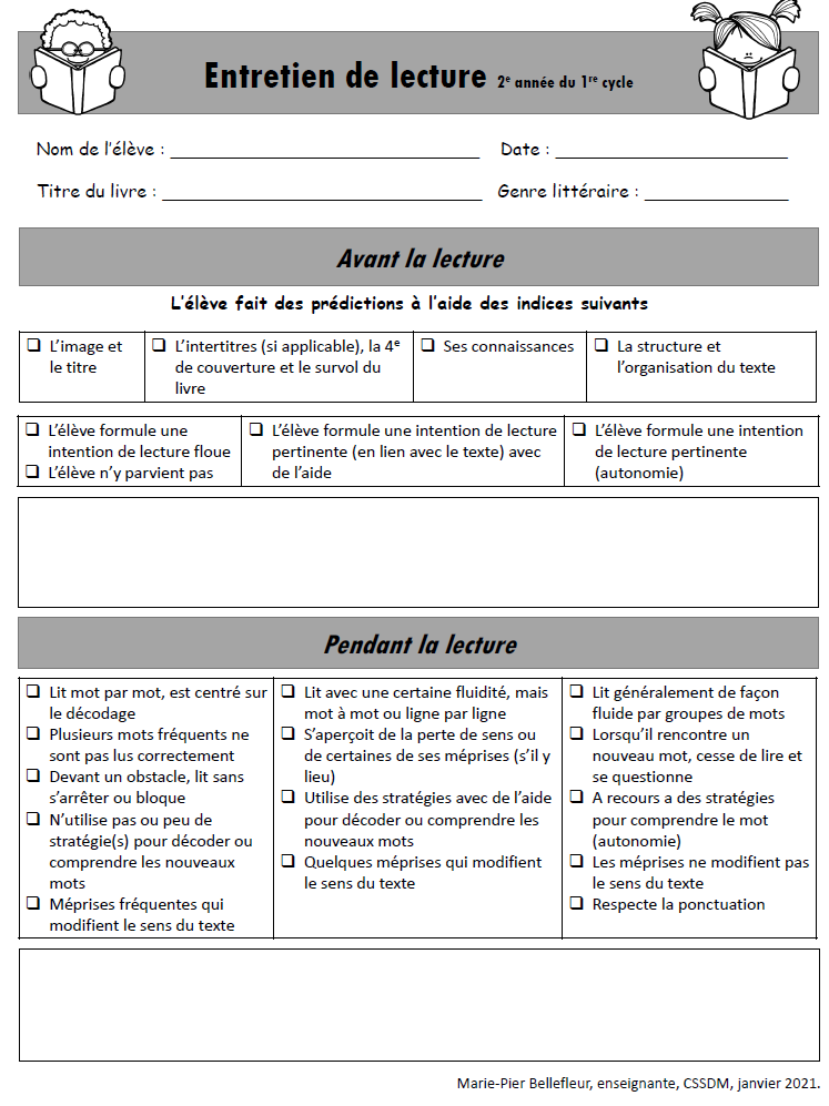 L’enseignant ou l’enseignante prépare des questions correspondant aux critères présentés dans le Cadre d’évaluation des apprentissages en lecture. Il ou elle offrira aussi une rétroaction à l’élève sur les stratégies qu’il ou elle utilise.