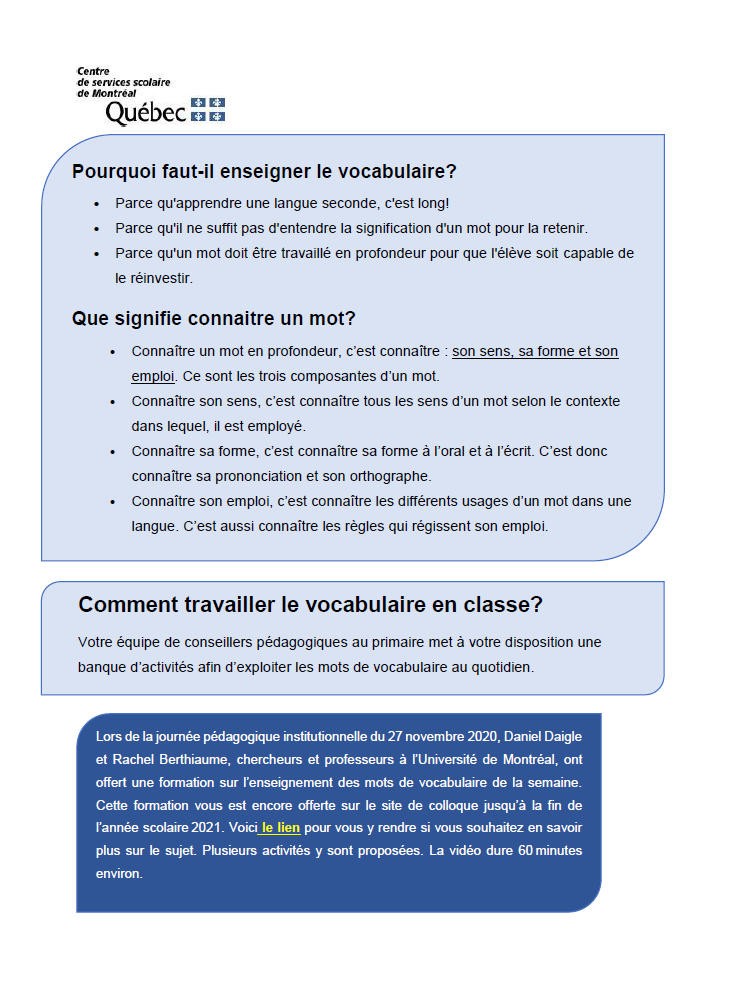 Le document ci-dessous présente des activités pour favoriser le développement du vocabulaire.