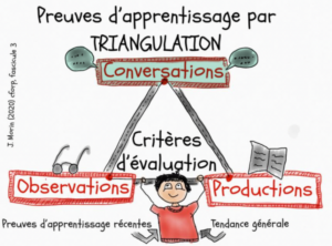 Idéalement, au début de l’étape, lors d’une planification en équipe, il faut prévoir quelles preuves d’apprentissage vous allez recueillir. Si vous observez régulièrement vos élèves et que vous consignez vos observations, il sera plus facile pour vous de porter un jugement et surtout d’ajuster l’enseignement pour répondre aux besoins des élèves. Il est important de rappeler que même si nous avons un bulletin chiffré, il faut évaluer à l’aide d’une cote et transformer ensuite cette cote en note à l’aide du barème de l’école. Ceci facilite l’évaluation, car il est plus facile de situer une compétence dans une cote que de la chiffrer. De plus, l’évaluation doit soutenir l’apprentissage, alors il est important que l’élève ait des rétroactions fréquentes sur les observations qui sont faites. Finalement, si vous avez un doute concernant l’évaluation d’un élève, il est possible de le rencontrer pour vous assurer de bien l’évaluer. Voici quelques idées pour vous soutenir dans l’élaboration de vos outils d’évaluation.